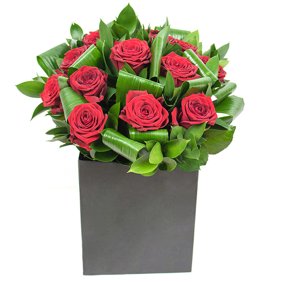 This elegant arrangement is the result of expert selection and thoughtful design. Each bloom is hand-picked to ensure optimal freshness and sublime beauty. The deep red hues of the roses contrast beautifully with lush green foliage, creating a dynamic and inviting display.