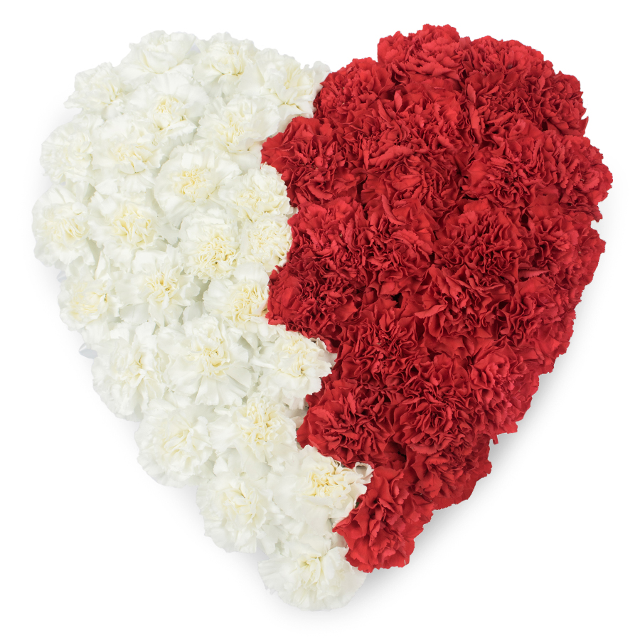 Add a touch of vibrancy and elegance to any occasion with our heart-shaped carnation bouquet, expertly crafted by Handy Flowers. This lively arrangement features a beautiful mix of white and red carnations, perfect for expressing a range of emotions.